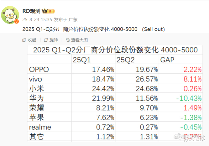 不信大家看行业人士“RD观测”在8月23日提供的2025年第一季度、第二季度4000-5000元各品牌份额变化对比数据。数据显示在第一季度小米是这个档次排名第一的品牌,市场份额为24.42%;华为是排名第二的品牌,市场份额为21.99%;vivo排名第三,市场份额为18.74%;OPPO排名第四,市场份额为17.46%;荣耀排名第五,市场份额为8.21%,苹果排名第六,市场份额为7.62%;realme排名第七,市场份额为0.72%。